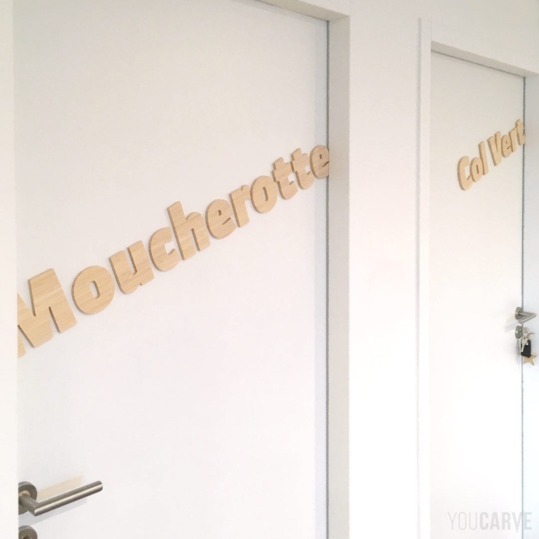 Denser and more contrasted than spruce, larch naturally fits into a higher range. It is ideal for showcasing the authenticity of wood in signage or decoration projects, creating a warm atmosphere or asserting a mountain aesthetic. Suitable for both indoor and outdoor use, 3-ply larch panels are the reference solution for outdoor signs with wood-cut letters in a natural wood look. In this case, the application of a protective treatment is highly recommended to guarantee optimal durability according to exposure conditions.