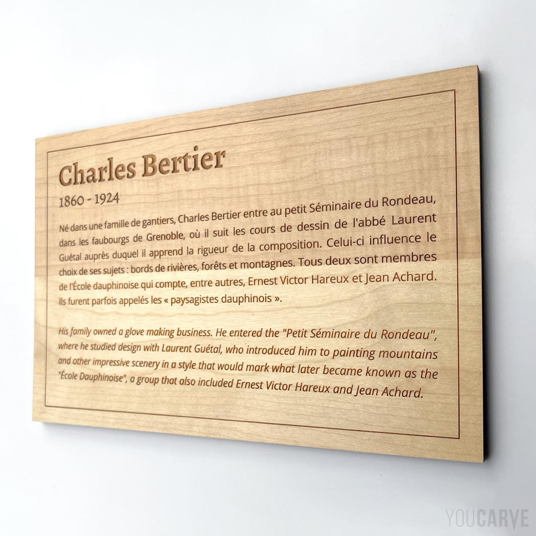 Recommended for indoor use only. Specifically adapted for laser cutting and engraving, these solid woods are the materials of choice for lettering and detailed shapes, especially in small dimensions. They are ideal for relief wall signage, lettering for museography, decorative signs, and fine interior decoration pieces.